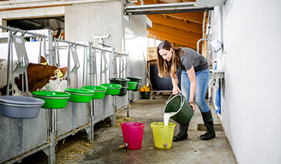 Mit Gruppen von 3 bzw. 5 Kälbern lassen sich kostengünstig Stallplätze einrichten. Die einzelnen Zaunelemente, ob mit Tür, ohne Tür oder Fressfanggitter, lassen sich beliebig kombinieren und anordnen.